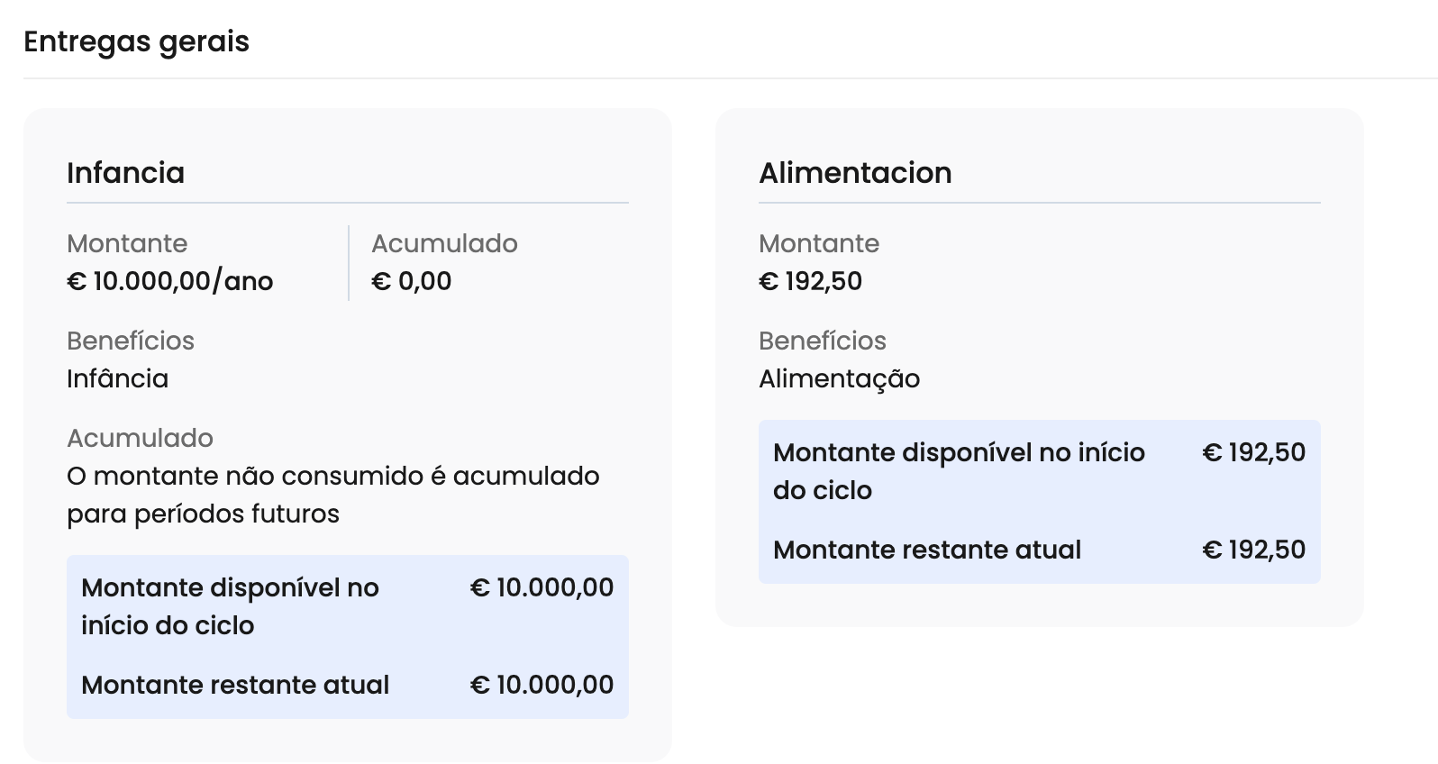 Nesta secção, é possível consultar as entregas de pacotes pagas pela empresa (benefício social) ativas no ciclo atual. Além disso, podes verificar se o colaborador tem montantes acumulados, o montante atribuído no início do ciclo e o montante disponível atualmente para o colaborador.
