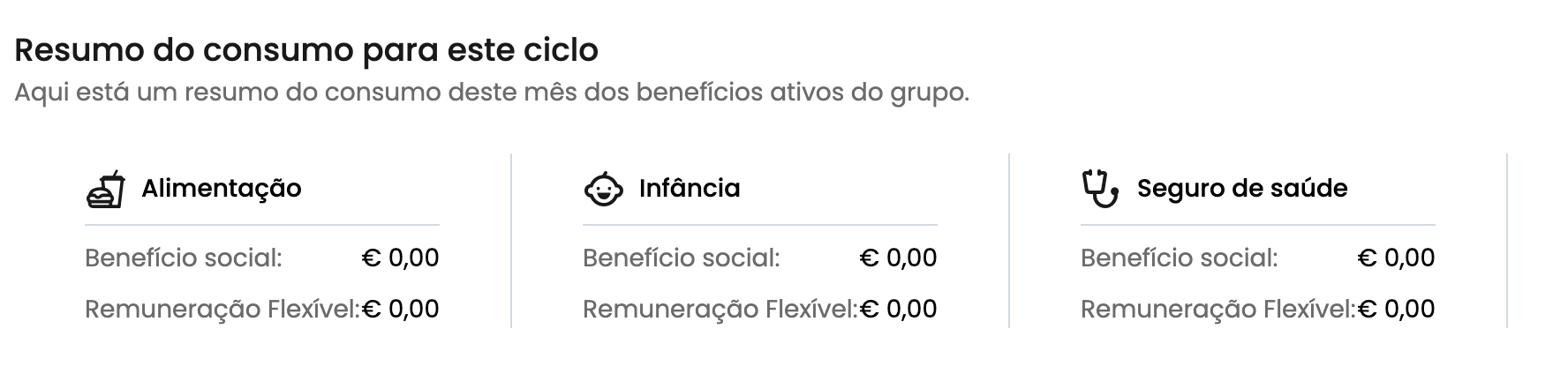 Nesta secção são mostrados todos os benefícios disponíveis no grupo de colaboradores ao qual pertence. Os consumos são discriminados por benefício social e retribuição flexível. Se o colaborador não tiver consumido algum benefício durante o decorrer do ciclo, será mostrado o valor 0,00€ em cada tipo.